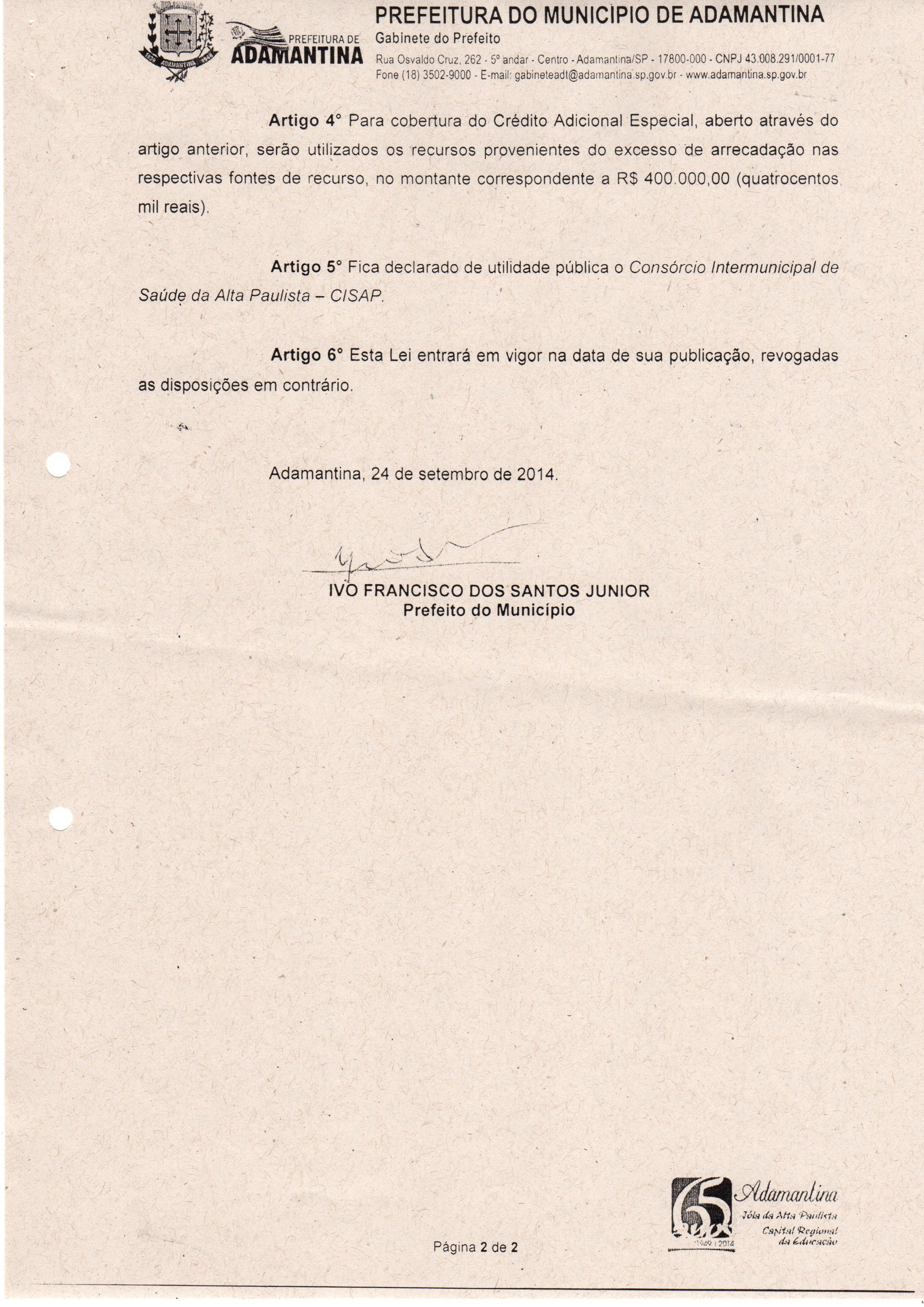 AUTORIZA O MUNICÍPIO DE ADAMANTINA A PARTICIPAR DO CONSÓRCIO INTERMUNICIPAL DE SAÚDE DA ALTA PAULISTA - CISAP E DA OUTRAS PROVIDÊNCIAS.