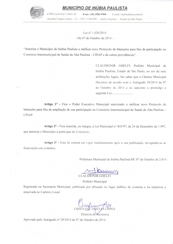 Autoriza o Município de Inúbia Paulista a ratificar novo protocolo de Intenções para fins de participação no Consórcio Intermunicipal de Saúde da Alta Paulista - CISAP e da outras providências.