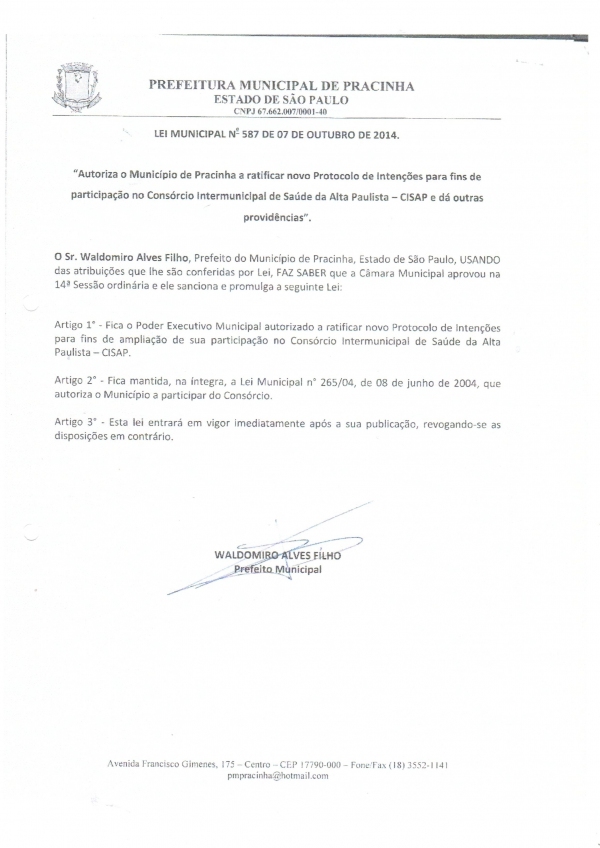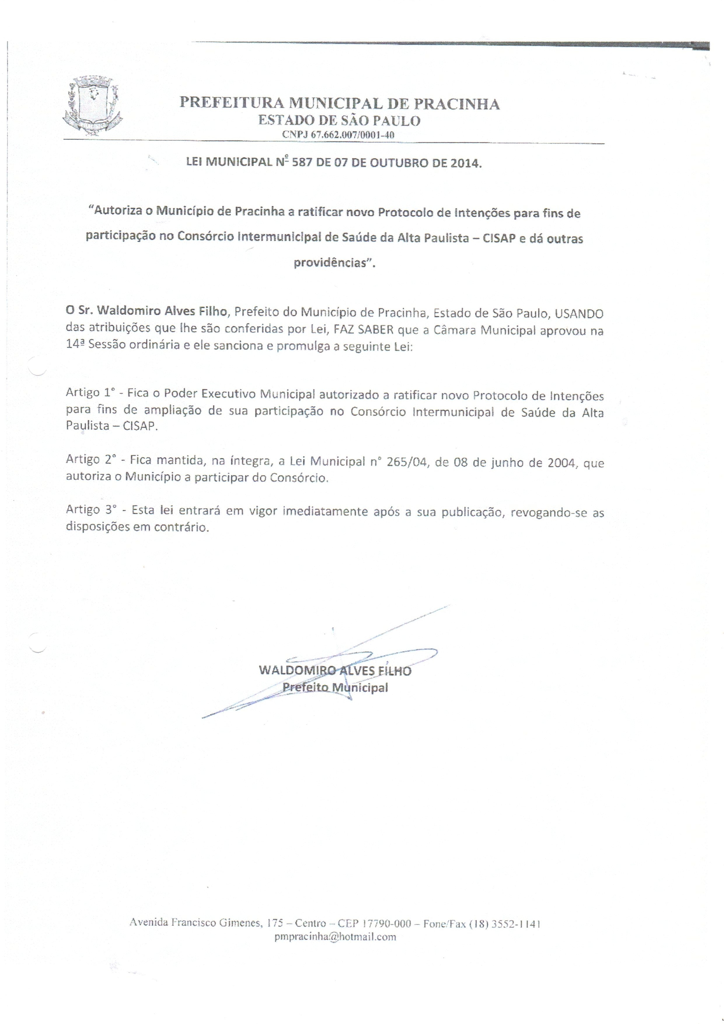 Autoriza o município de Pracinha a ratificar novo Protocolo de Intençoes para fins de participação no Consórcio Intermunicipal de Saúde da Alta Paulista - CISAP e da outras providências.